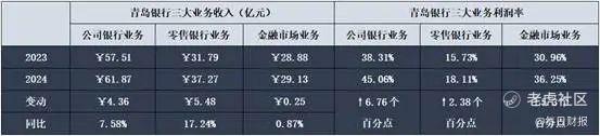 作为核心增长极,青岛银行公司业务收入同比增长7.58%至61.87亿元,利润率提升6.76个百分点至45.06%,占营收比重维持在46%左右。