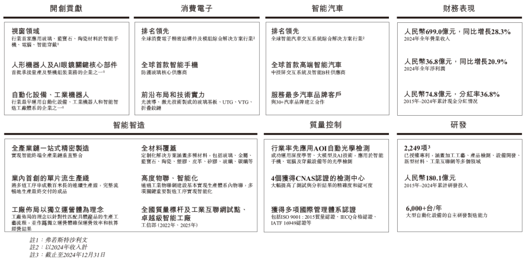 消费电子,为智能手机、计算机、智能穿戴等消费电子产品提供防护玻璃、金属中框、触控显示模块、生物识别、无线充电等结构件和功能模块产品,以及整机组装。公司的定制化解决方案涵盖多种材料,包括玻璃、金属、蓝宝石、陶瓷、塑料、皮革、硅胶、玻纤、碳纤等。
