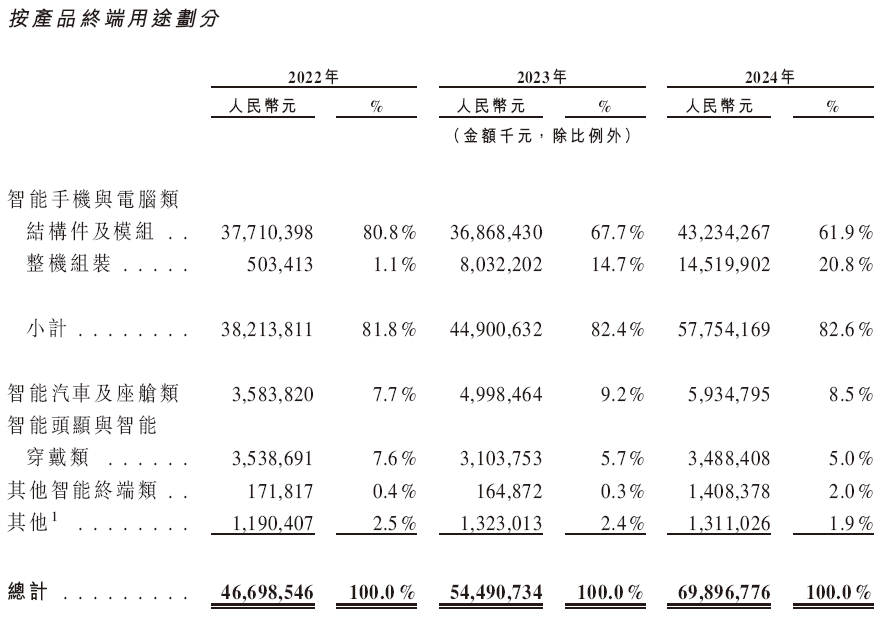 蓝思科技的收入主要来自提供各类智能终端精密制造解决方案,包括智能手机及计算机、智能汽车及座舱、智能头显与智能穿戴类及其他智能终端类,解决方案包括结构件、模块和整机组装。