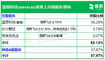 周群飞女士通过蓝思科技(香港)持股56.28%,通过长沙群欣(周群飞女士97.90%,其配偶郑俊龙先生2.10%)持股5.78%;