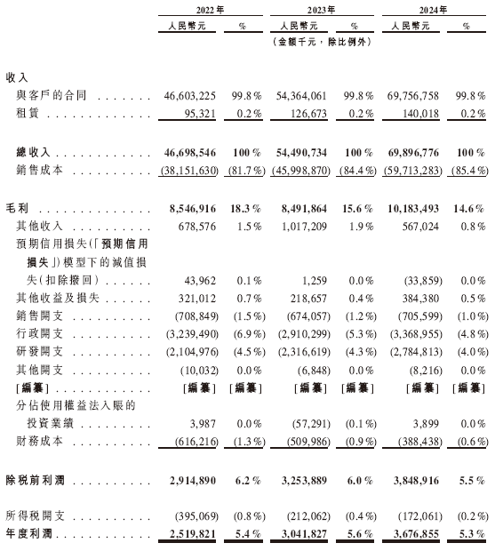 招股书显示,在过去的2022年、2023年、2024年,蓝思科技的营业收入分别人民币466.99亿、544.91亿和698.97亿元,相应的净利润分别为人民币25.20亿、30.42亿和36.77亿元。