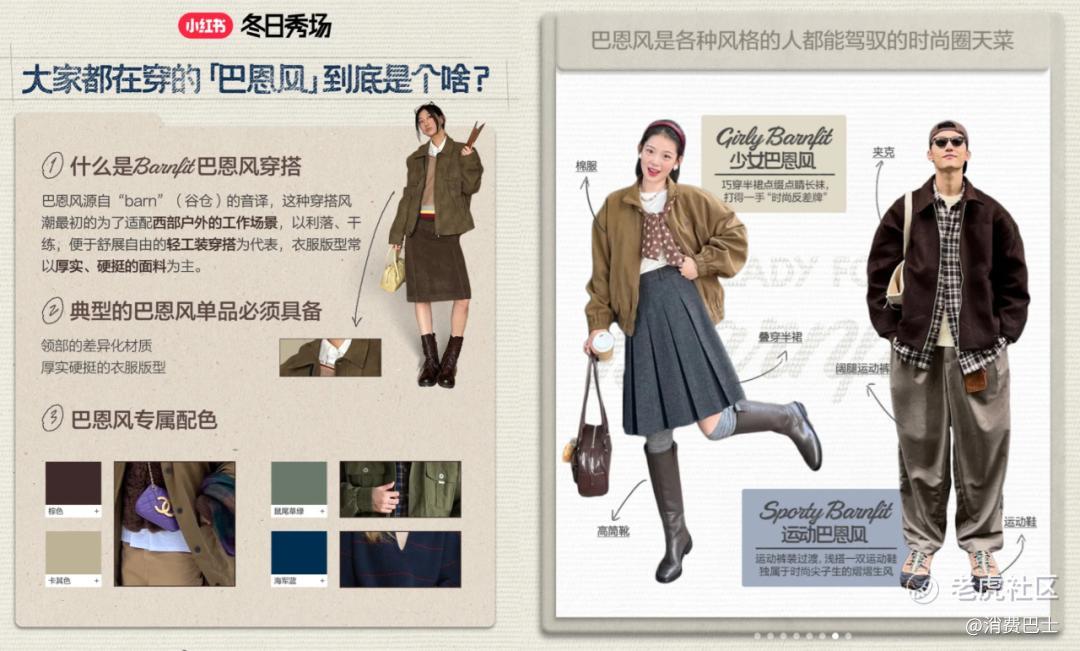 “巴恩风”的诞生,源于小红书发现去年冬天,人们热衷讨论冬天穿什么能不显臃肿,除了常规的黑白灰还能有什么色彩穿搭。电商团队发现夹克这个品类能解决这些需求,且该单品的搜索和成交趋势确实从11月开始提升。
