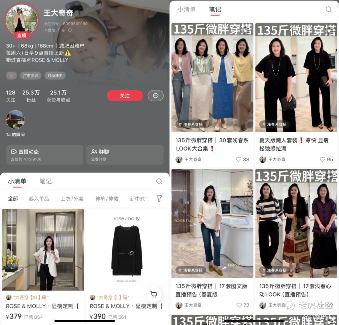 24年9月,王大奇奇在小红书上转做主理人,成立品牌“Rose&molly”,将目标用户锁定在120斤-160斤的人,只为这“40斤”的人她们做“显瘦定制”。