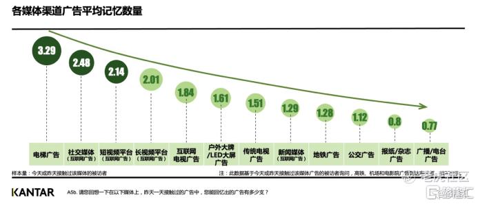 凯度研究报告显示,电梯媒体在消费者关注度和记忆度、消费者购买转化意愿等方面的表现均居于各媒体渠道首位,在消费者触达率和接触时长方面亦呈现领先优势。