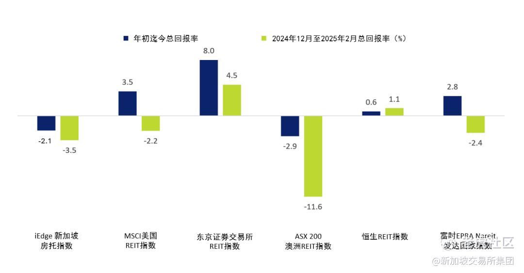 截至 2025 年 2 月的三个月内,新加坡房地产投资信托基金(S-REITs)的总回报率为-3.5%,富时 EPRA Nareit 发达国家指数(FTSE EPRA Nareit Developed Index)的回报率为 -2.4%。2024 年 12 月至 2025 年 2 月期间,S-REITs机构投资者净卖出5.608 亿新元,而散户投资者净买入6.076亿新元。