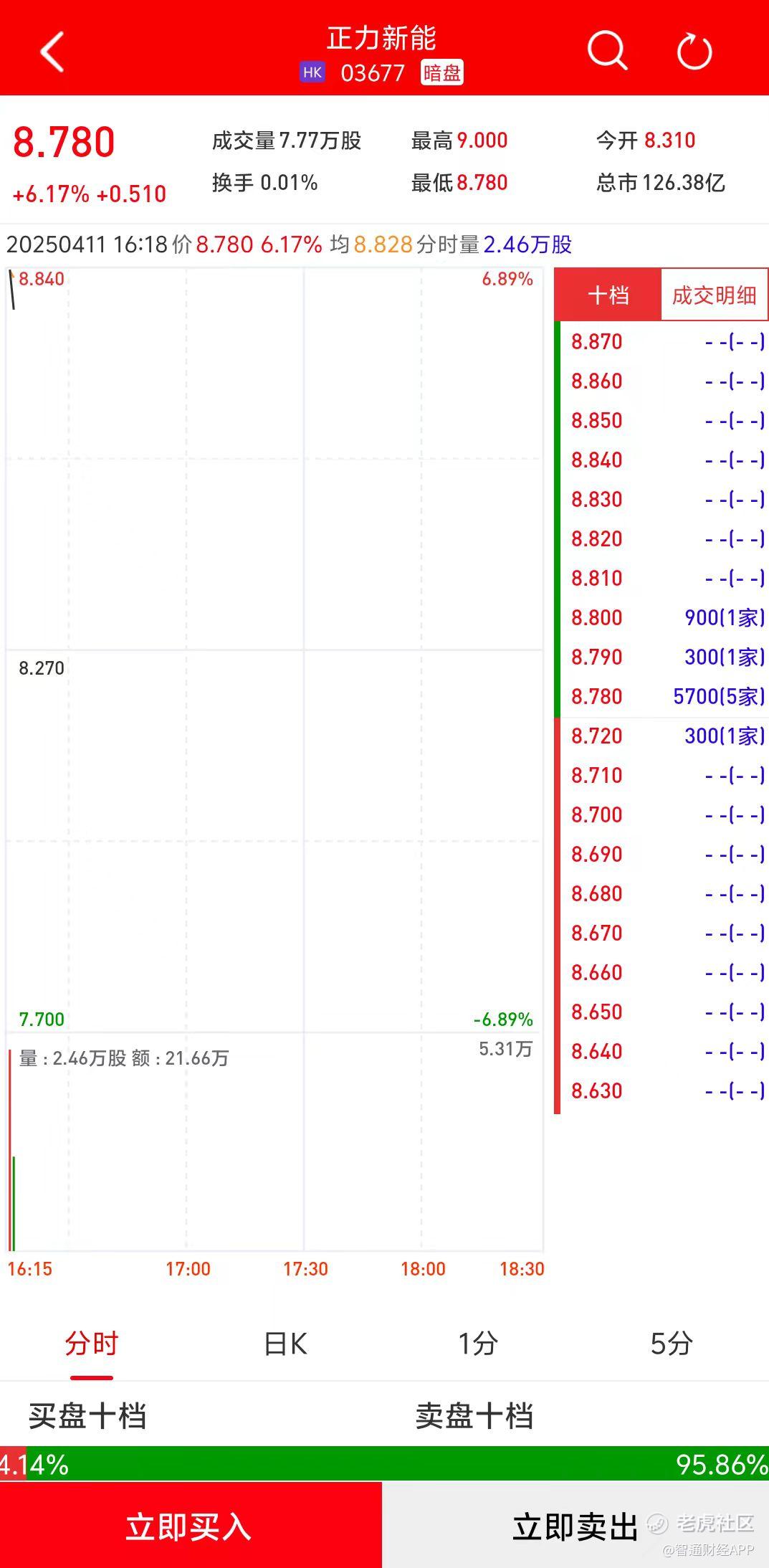 智通财经APP获悉,正力新能(03677) $正力新能(03677)$ 将于4月14日(星期一)在香港挂牌。截至发稿,利弗莫尔证券暗盘交易显示报价8.78港元,较招股价8.27港元上涨6.17%,每手300股,不计手续费,每手赚153港元。