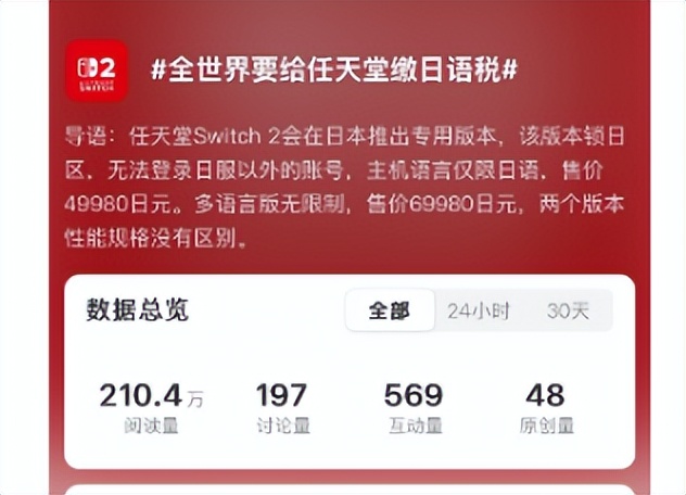 4月3日,#全世界都要给任天堂缴日语税#登上热搜。实时阅读量210多万。