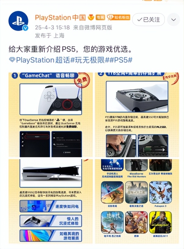 4月3日下午,任天堂发布会第二天,PS中国官微发布微博:向大家重新介绍PS5,您的游戏优选。