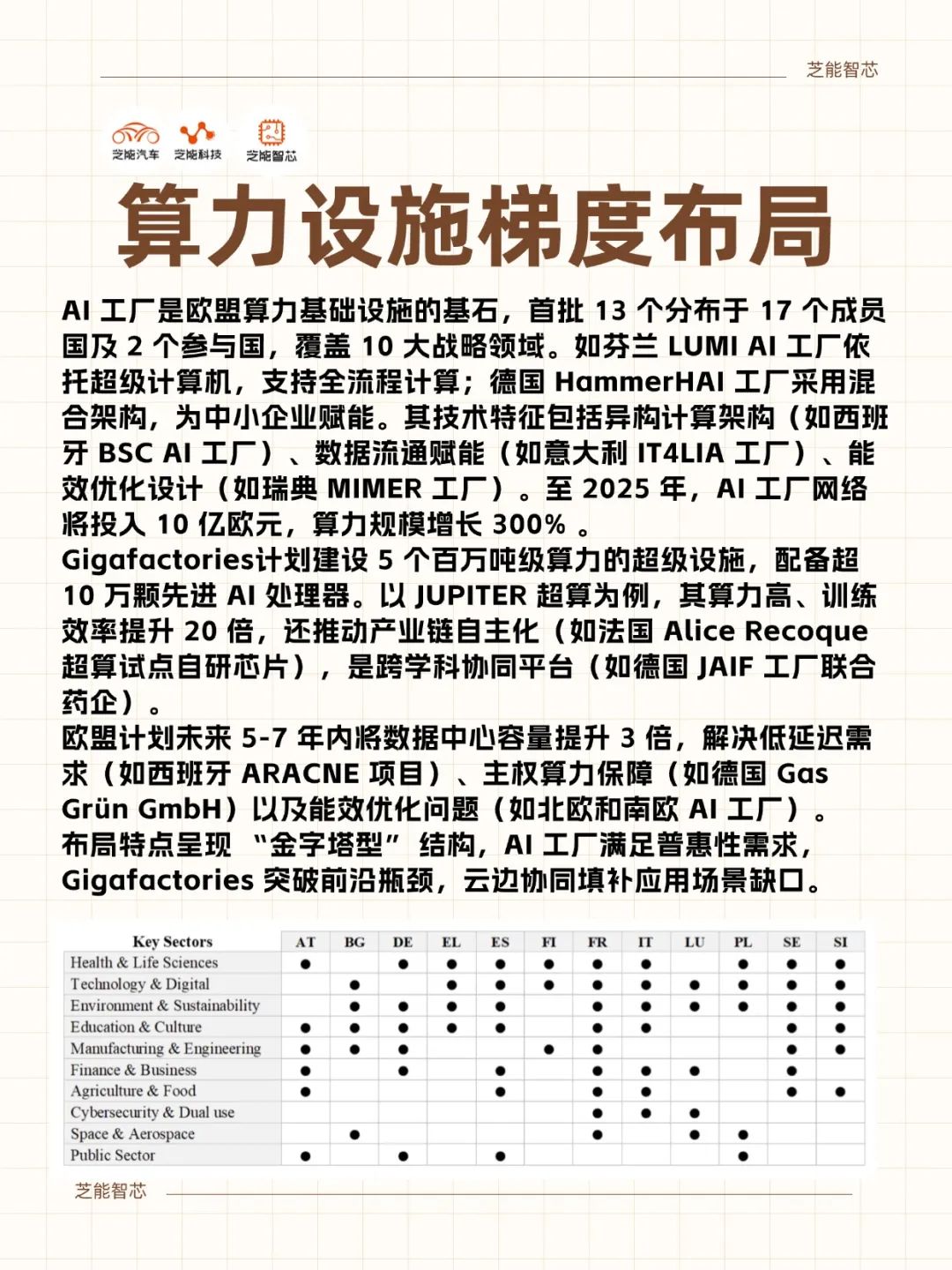 欧盟的AI工厂计划是算力基础设施的基石,首批13个AI工厂分布于17个成员国及2个参与国,覆盖健康、制造、能源、农业等10大战略领域,通过分布式算力网络满足多样化的AI应用需求。