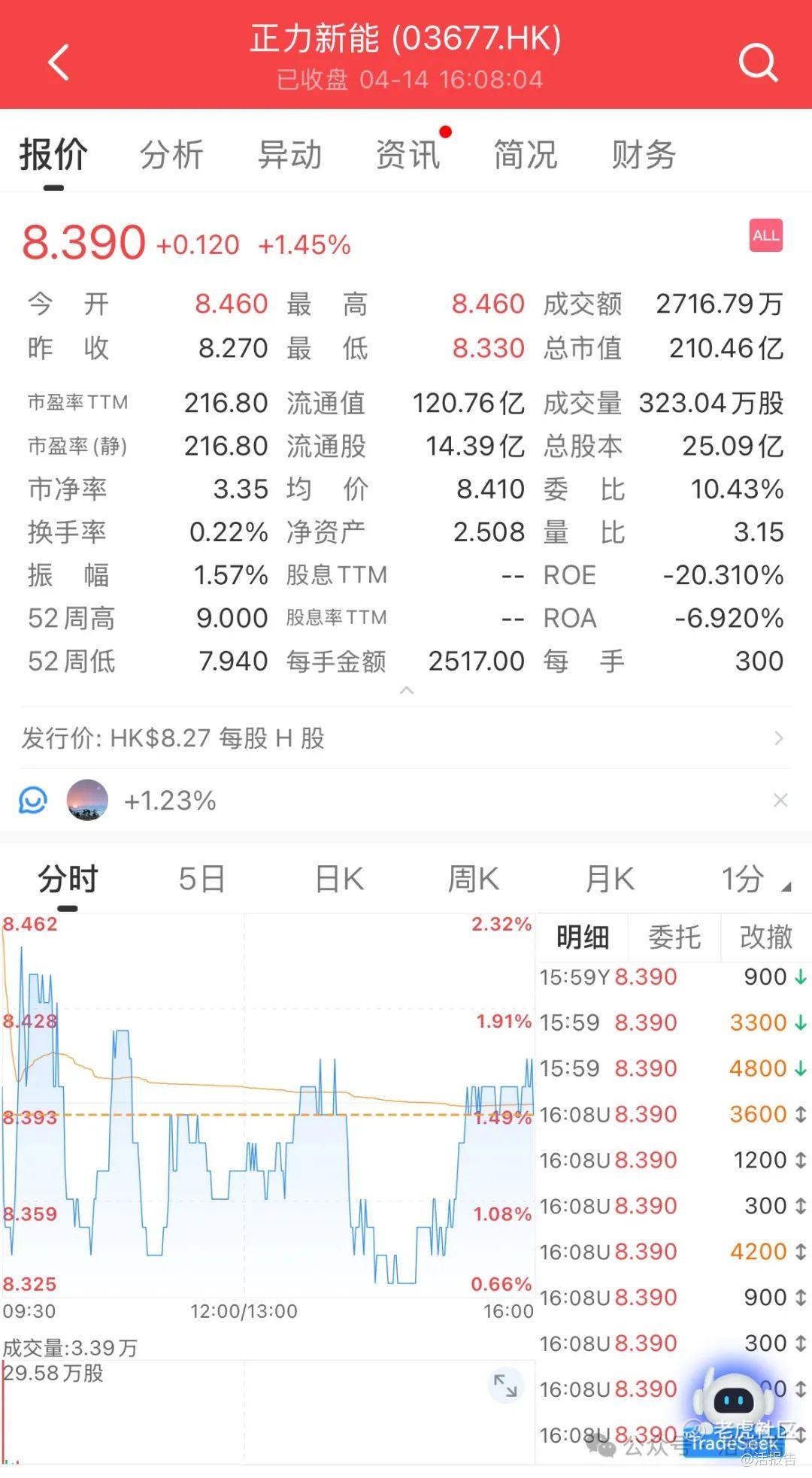 上市首日,正力新能高开2.3%,报8.46港元/股,中途窄幅震荡,最终收涨1.45%,报8.39港元/股,全日成交额2716.79万港元,最新总市值210.46亿港元。不计手续费,一手赚36港元。