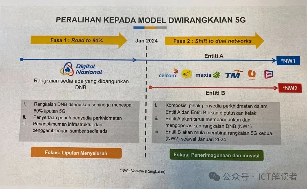 2023年5月,新一届马来西亚政府宣布从单一批发网络模式转向双5G网络模式。这一转变旨在通过引入竞争,提高服务质量,并扩大5G网络的覆盖范围,特别是在未充分服务和偏远地区。根据新政策,只有在DNB的5G网络覆盖率达到80%后,才能允许建设第二张5G网络。