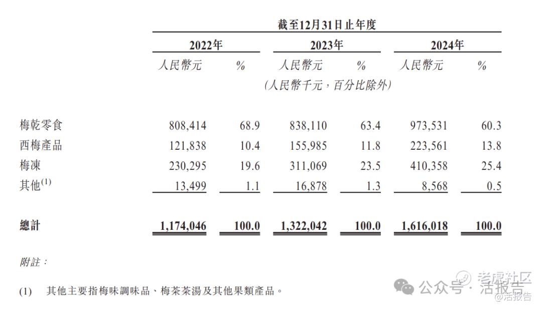 根据弗若斯特沙利文的资料,于2024年,按零售额计,该公司在中国果类零食行业排名第一,市场份额为4.9%。此外,根据同一资料来源,于2024年,按零售额计算,他们在中国梅产品行业排名第一,市场份额为7.0%。于2021年至2024年,按零售额计,公司在青梅果类零食行业及西梅果类零食行业连续四年排名第一。