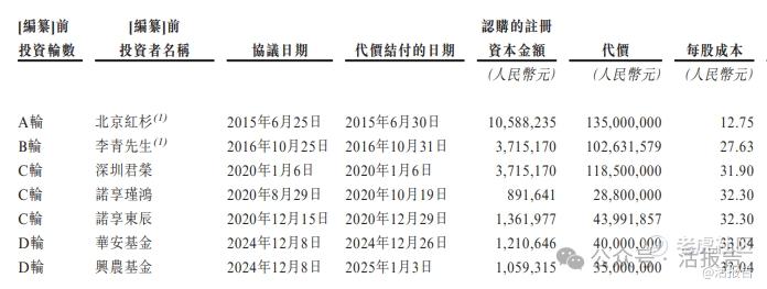 公司于2015年至2025年进行过四次上市前融资,累计融资5.04亿人民币。按2025年1月的最新D轮融资看,每股成本33.04元,即公司上市前估值约为22.25亿人民币(约23.67亿港元)。