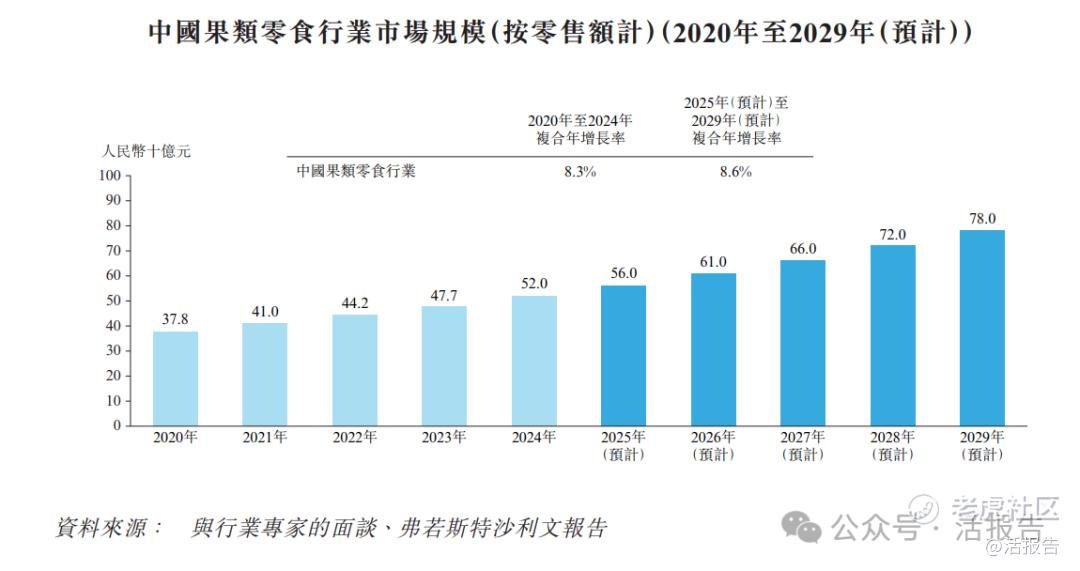 于2024年,中国果类零食行业的市场规模(按零售额计)达到人民币520亿元,前五大市 场参与者占市场份额14.5%。于2024年,本公司在中国果类零食行业中排名第一(按零售额 计),市场份额为4.9%。