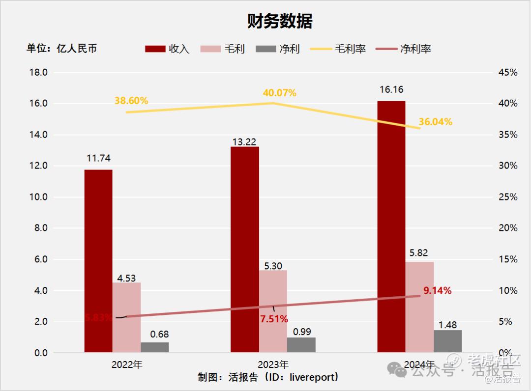 公司2022-2024年收入、利润持续增长,虽2024年毛利率下滑4个百分点,但净利润连续两年增长超过40%,净利率连续攀升至9%以上。