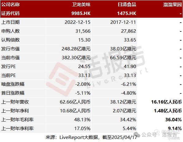 同行业IPO可比公司有:卫龙美味(9985.HK)、日清食品(1475.HK)