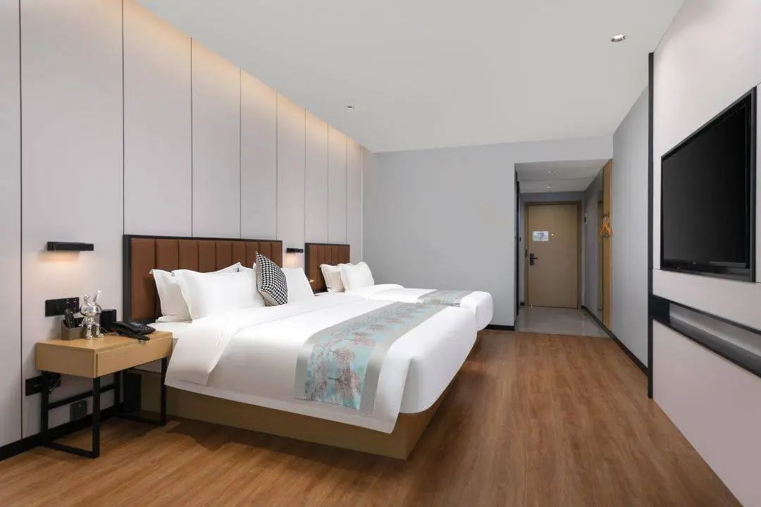 酒店大堂采用深色调与木质元素搭配暖,色调射灯与几何灯饰交相辉映,营造出自由而宁静的氛围。客房设计沉静内敛,灰白木色基调中点缀印花元素,纱质窗帘过滤出柔和阳光,干净利落的线条设计让疲惫瞬间消散。五一期间,酒店特别推出豪华套房、家庭房、智能影音房及电竞房等多种房型,满足情侣度假、亲子出行或朋友聚会的多样化需求。
