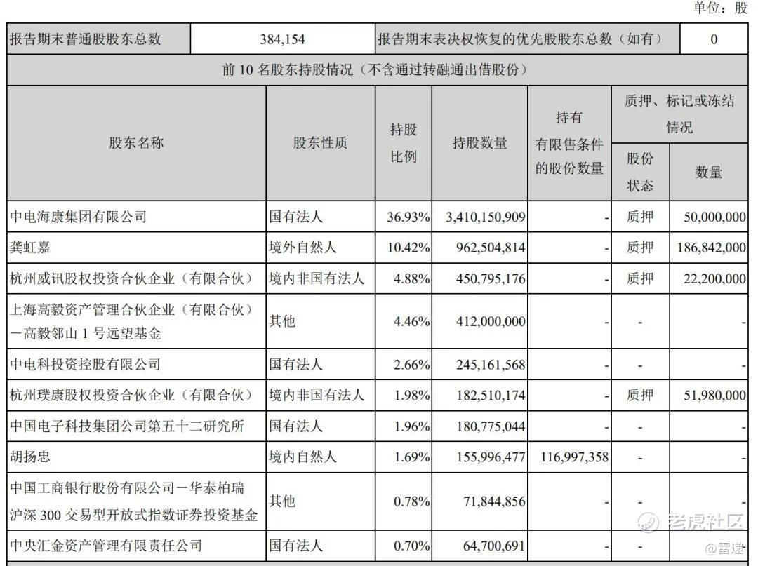 截至2024年9月30日,中电海康集团有限公司持股36.93%,龚虹嘉持股10.42%,杭州威讯股权投资合伙企业(有限合伙)持股4.88%,上海高毅资产管理合伙企业(有限合伙)-高毅邻山1号远望基金持股为4.46%;