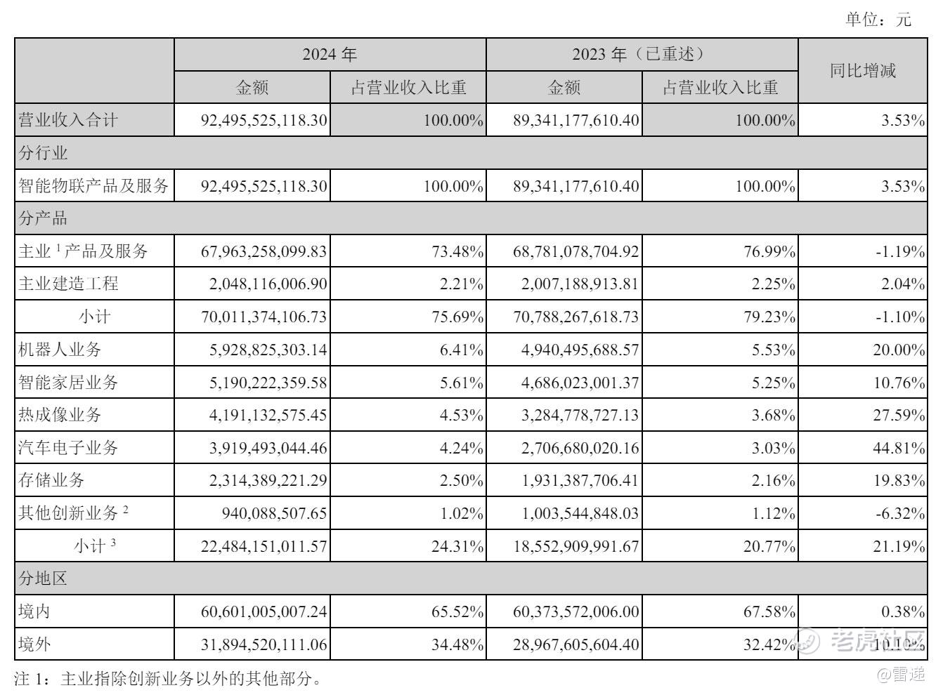 其中,海康威视2024年来自机器人业务的收入为59.29亿元,较上年同期的49.4亿元增长20%;智能家居业务业务营收为51.9亿元,较上年同期的46.86亿元增长10.76%;