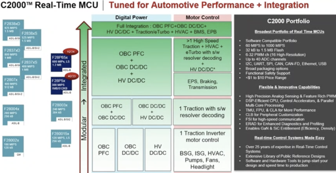 ● 在汽车电子中,C2000的其主要场景包括:电机控制、数字电源控制、车辆状态监测等。芯片集成了逻辑块,降低了对外围电路的依赖,简化了系统设计。