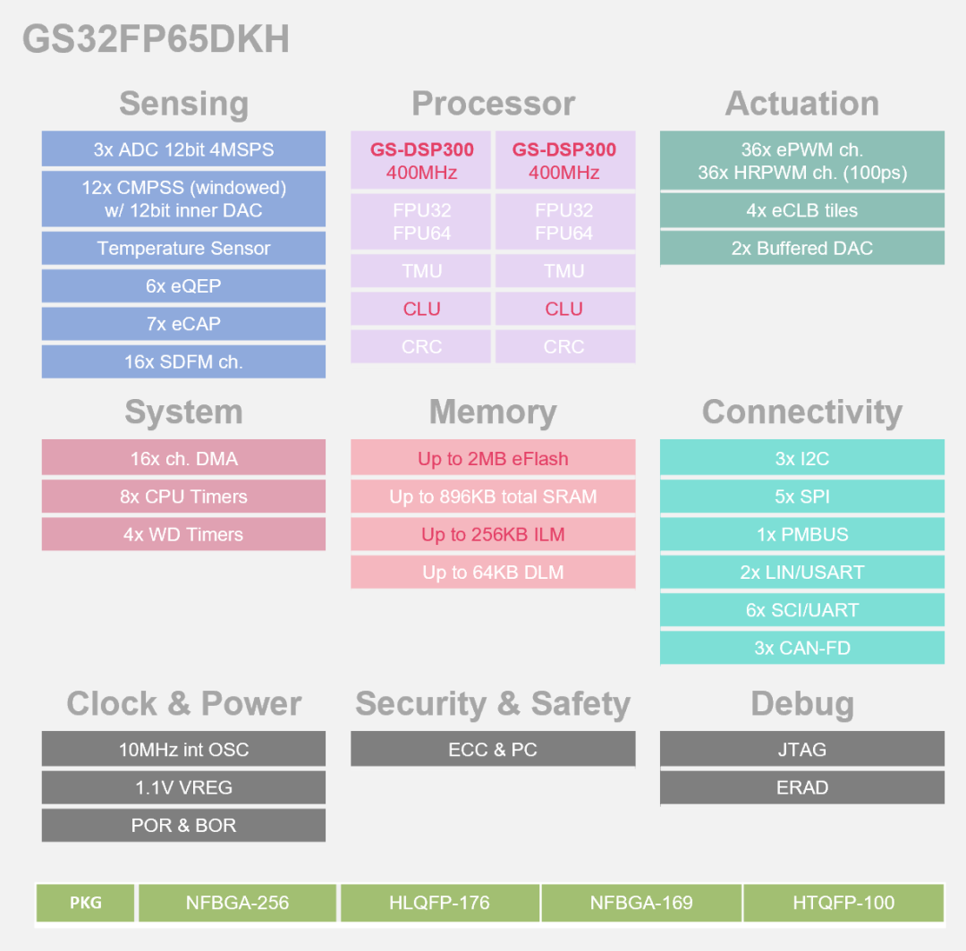 ◎ 高性能型如 GS32FF65DKH 等,部分配备双 GS-DSP300,主频达 400MHz,eFlash 和 SRAM 容量更大,多场景覆盖能力,支持复杂电源管理和高性能应用。
