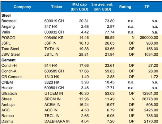 我们看好海螺水泥(00914.HK/600585.CH)、华润建材科技(01313.HK)、金达尔钢铁电力公司(JSPL)和塔塔钢铁(Tata Steel)。