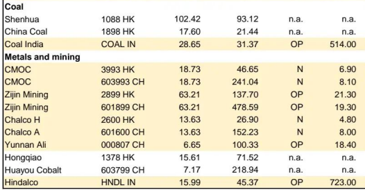 (备注:评级“Rating”中,OP代表跑赢大市,UP代表逊于大市,N为中性。n.a为未覆盖)