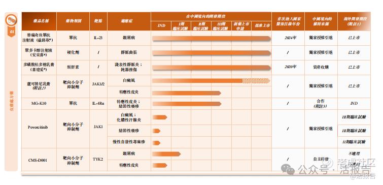 公司的主要产品管线包括三款已上市产品、四款处于临床阶段或后期阶段的候选产品及两款临床前候选产品,覆盖银屑病、白癜风、特应性皮炎(AD)、皮肤挫伤、浅表性静脉炎、静脉曲张、化脓性汗腺炎(HS)、结节性痒疹(PN)、慢性自发性荨麻疹(CSU)等主要皮肤疾病;