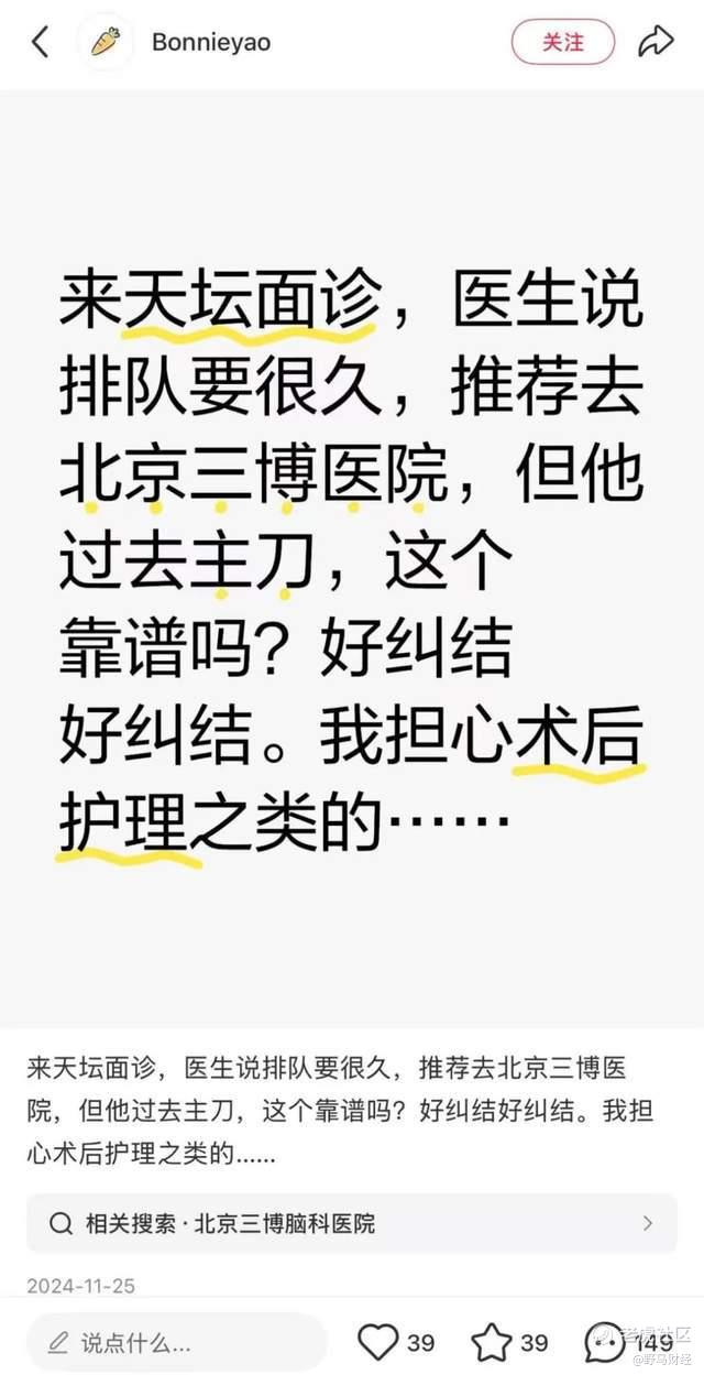 不少网友曾在社交平台提到,去天坛医院面诊,但因为手术排队太久,被推荐到了三博脑科。天坛医院的医生还表示,他会过去主刀。