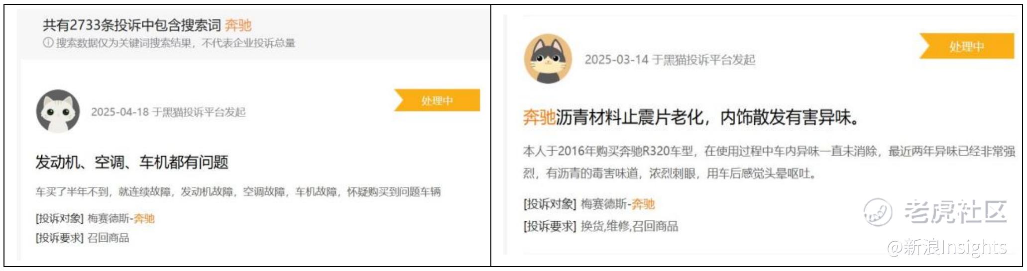在黑猫投诉上,与奔驰有关的投诉高达2733条,涉及车辆质量和服务等问题。其中,有车主表示,“买车不到半年,发动机、空调、车机接连出现故障”,还有车主表示“奔驰沥青材料止震片老化,内饰散发有害异味”。