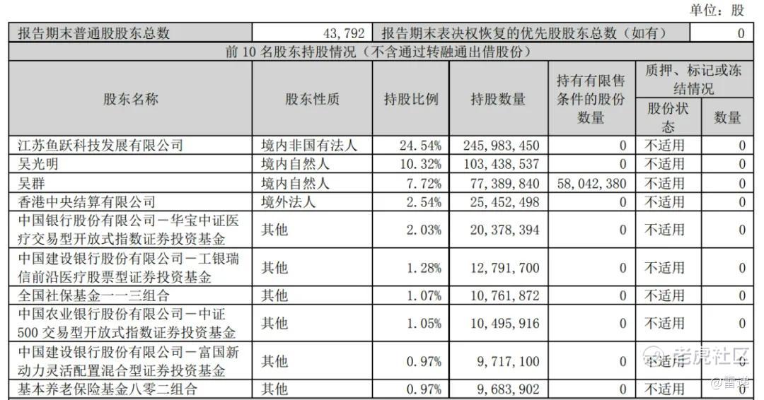 截至2024年12月31日,江苏鱼跃科技发展有限公司持股为24.54%,吴光明持股为10.32%,吴群持股为7.72%,香港中央结算有限公司持股为2.94%,中国银行股份有限公司-华宝中证医疗交易型开放式指数证券投资基金持股为1.97%;