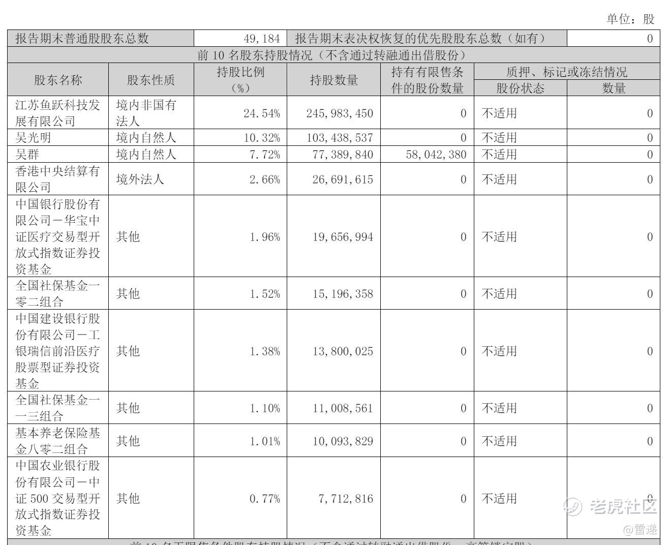 截至2025年3月31日,江苏鱼跃科技发展有限公司持股为24.54%,吴光明持股为10.32%,吴群持股为7.72%,香港中央结算有限公司持股为2.66%,中国银行股份有限公司-华宝中证医疗交易型开放式指数证券投资基金持股为1.96%,全国社保基金一零二组合持股为1.52%;