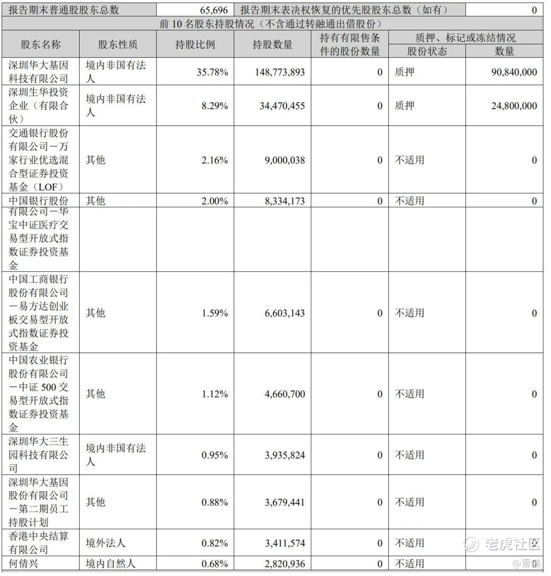 截至2024年9月30日,圳华大基因科技有限公司持股为35.78%,深圳前海华大基因投资企业(有限合伙)持股为8.29%,交通银行股份有限公司-万家行业优选混合型证券投资基金(LOF)持股为2.16%,中国银行股份有限公司-华宝中证医疗交易型开放式指数证券投资基金持股为2%,中国工商银行股份有限公司-易方达创业板交易型开放式指数证券投资基金持股为1.59%;