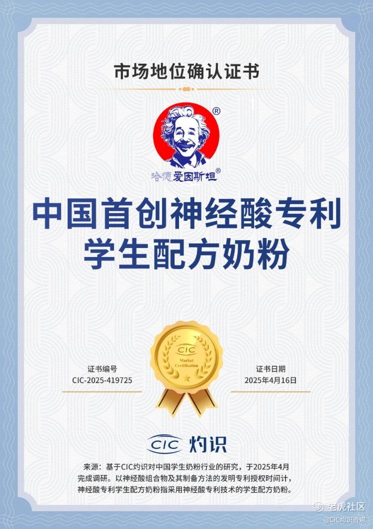 近日,哈德爱因斯坦获得由知名权威咨询机构CIC灼识授予的“中国首创神经酸专利学生配方奶粉”市场地位确认证书!