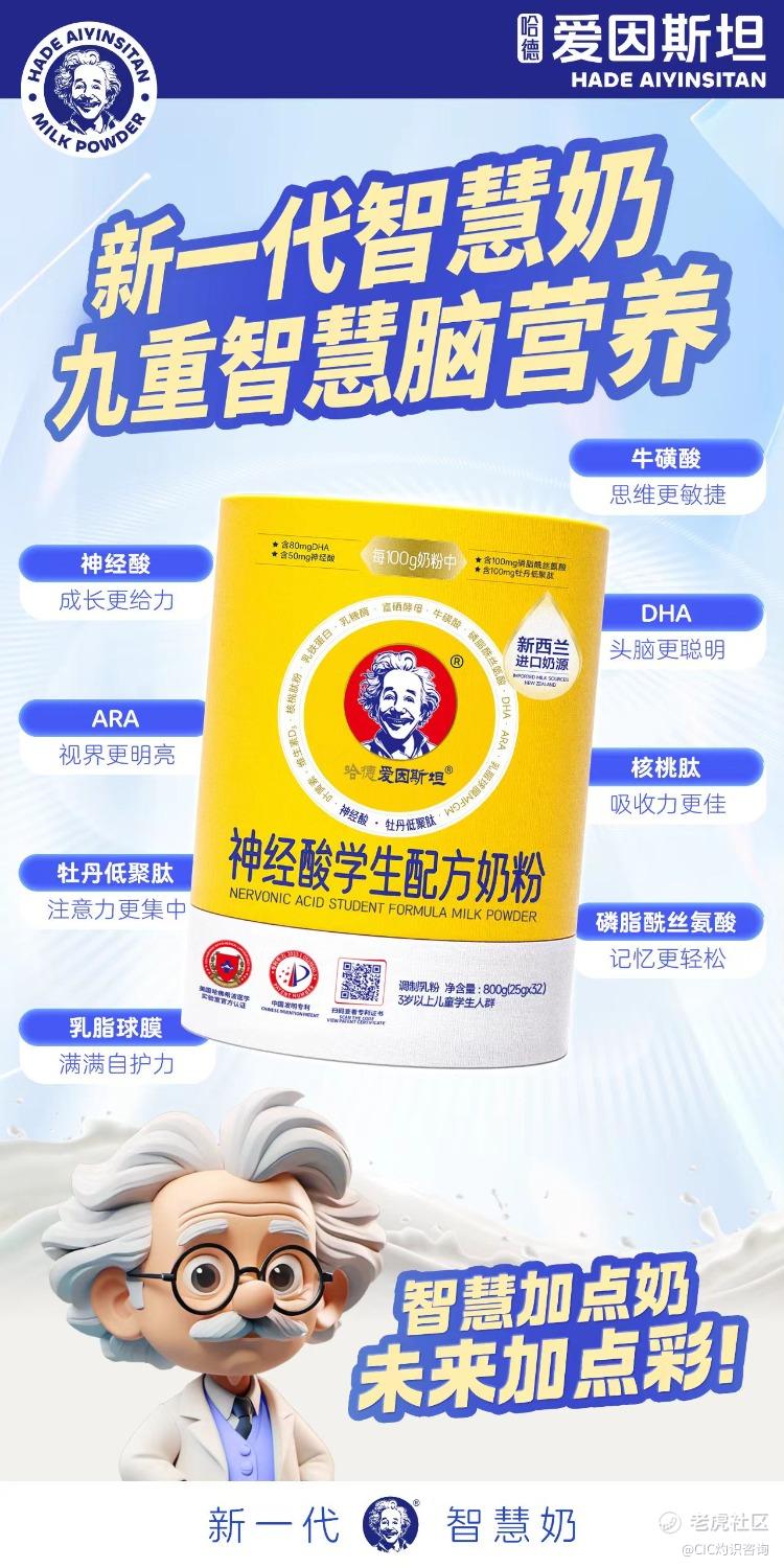 哈德爱因斯坦品牌隶属于阿尔伯特(广州)生物科技有限公司,品牌的诞生源自对爱因斯坦探索未知、勇于创新精神的深深敬意。秉持着“每一个学生都拥有成为未来爱因斯坦的潜力”的信念,哈德爱因斯坦一直致力于为青少年学生提供全面的营养支持,帮助他们补充“全脑营养”,加强大脑发育,提升智慧力。品牌科研团队凭借强大的研发能力与在营养学和神经科学领域的深厚积累,推出了哈德爱因斯坦神经酸学生配方奶粉,奶粉配方中含有神经酸、DHA、磷脂酰丝氨酸、牡丹低聚肽等关键营养素,其中神经酸成分具有修复受损细胞和神经元、改善专注力、促进大脑发育、促进脑白质生成等功效。针对神经酸成分,公司已获得两项国家发明专利授权——《一种提高记忆学习功能的神经酸组合物及其制备方法》(专利号:ZL202410249639.7)与《一种提升神经酸纯度的方法》(专利公布号:ZL202411559320.0)。