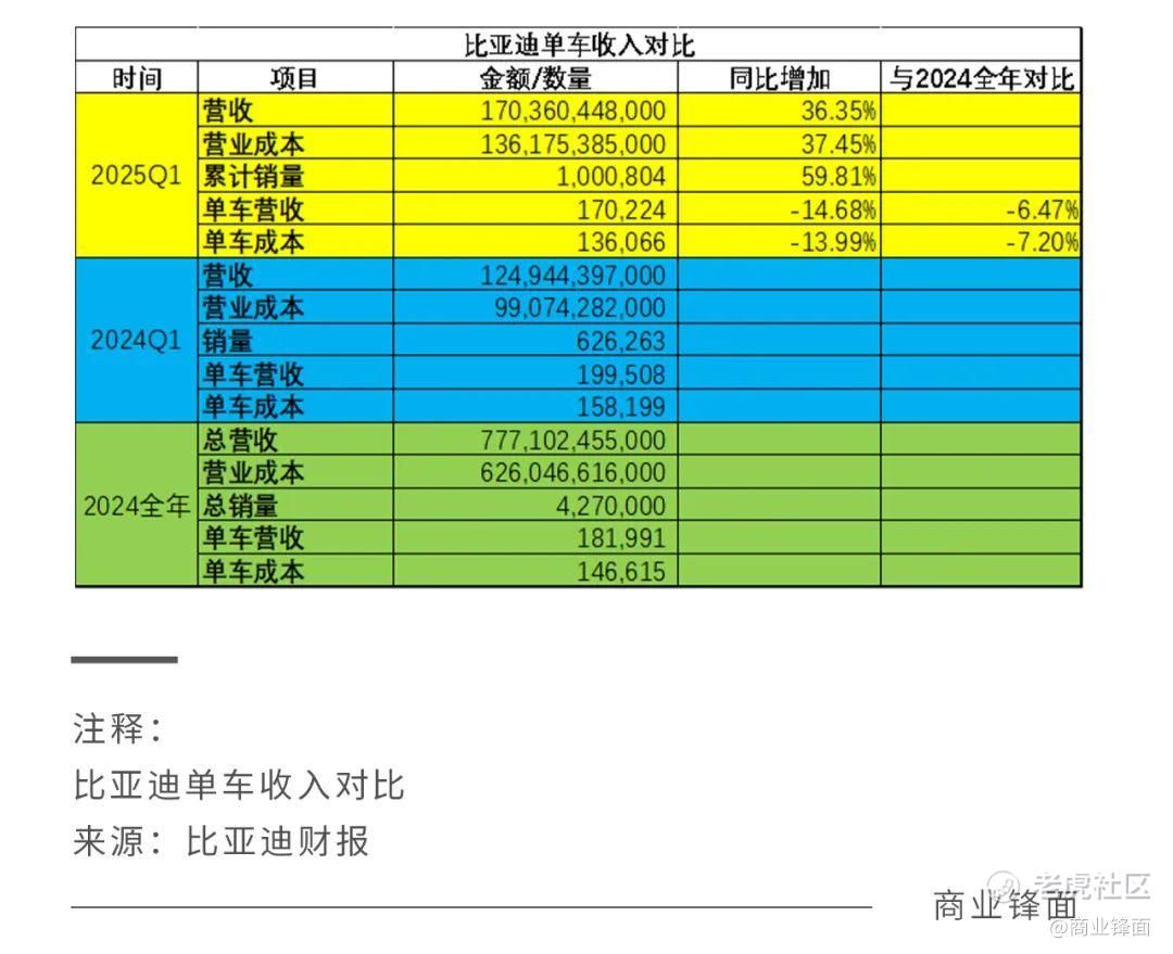 从收入和成本端看,比亚迪2025年一季度累计销量同比增长近60%,但单车收入同比下降14.68%,相较2024年全年下降6.46%。这显示公司整体仍在执行主动降价策略。单车成本同比下降13.99%,相较24年全年下降了7.2%,下降幅度与单车收入的下降基本同步,说明比亚迪的降价策略是由规模效应带来的成本下降所主导的,而非单纯促销降价。