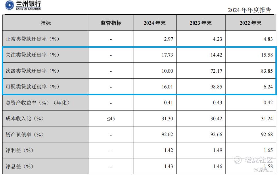 2024年,兰州银行的关注类贷款迁徙率,从2023年的14.42%飙升至17.73%;次级类贷款迁徙率虽从72.17%骤降至10%,但可疑类贷款迁徙率却从98.85%暴跌至16.01%。