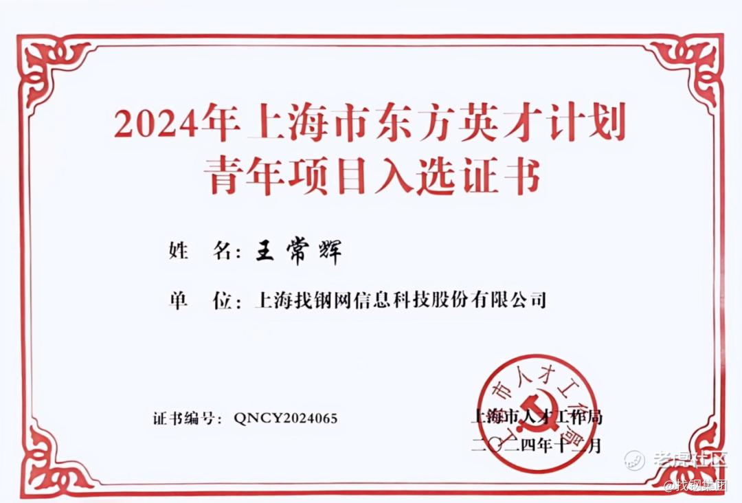 近日,上海市人才工作局正式公布了2024年上海市东方英才计划名单,找钢集团联合创始人、首席运营官王常辉先生入选“2024年度上海市东方英才计划青年项目”。
