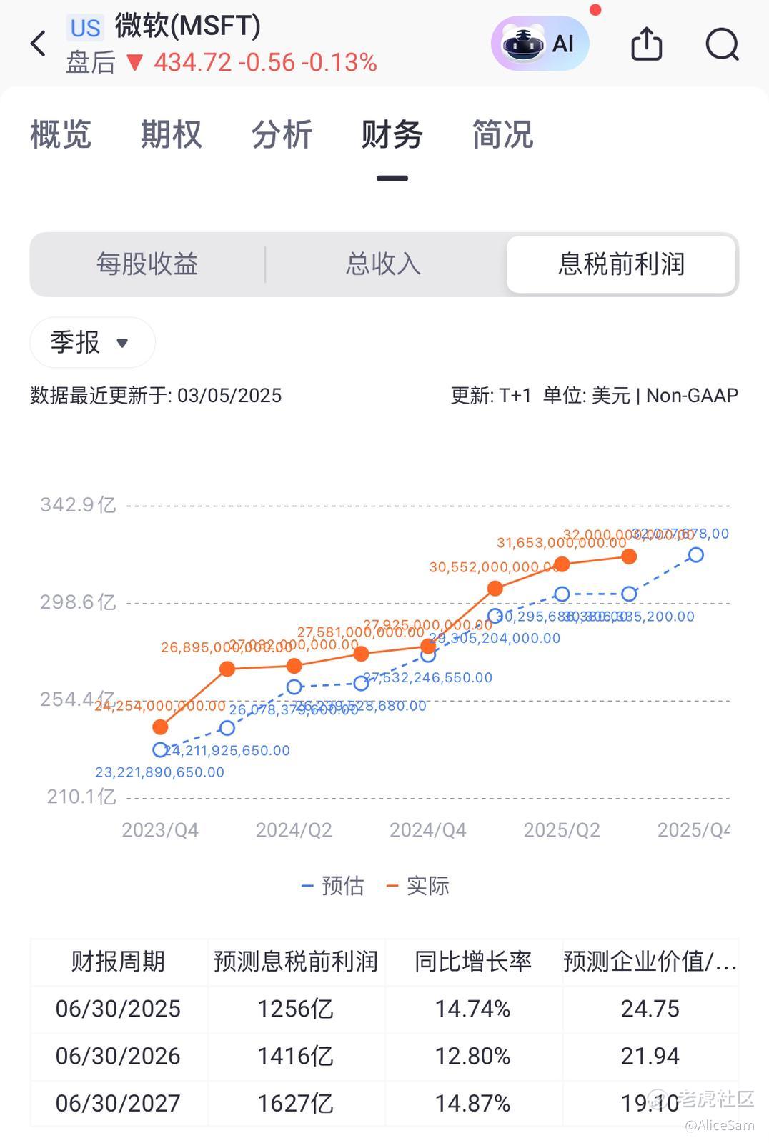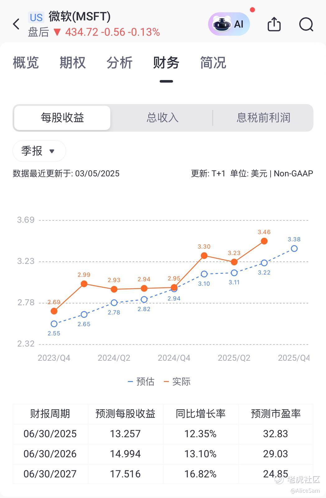 微软这个季度的每股收益(EPS)为3.46美元,同比增长18%,超出市场预期的3.22美元。从我们老虎财务页面的对比图看,他们EPS的增长巨大,并且下个季度的预期也是高高在上 👍