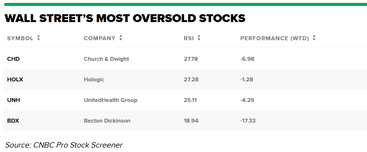 被低估的股票包括UnitedHealth Group(UNH)和Church & Dwight(CHD),两者的RSI分别为25.11和27.78。