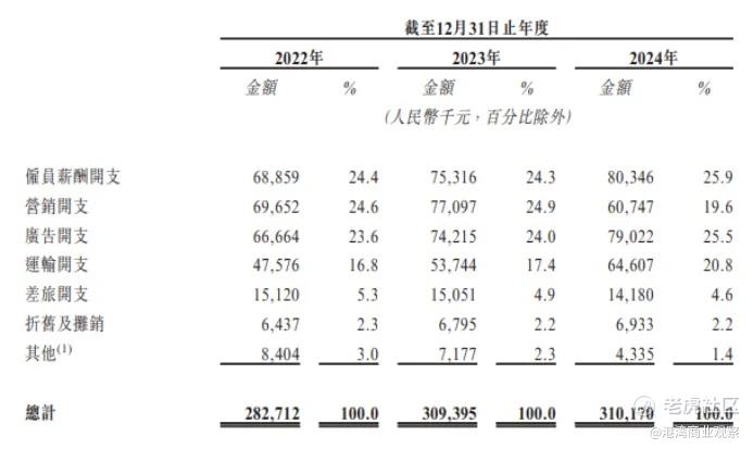 雇员薪酬开支分别为6885.9万、7531.6万、8034.6万,占比分别为24.4%、24.3%、25.9%;运输开支分别为4757.6万、5374.4万、6460.7万,占比分别为16.8%、17.4%、20.8%。