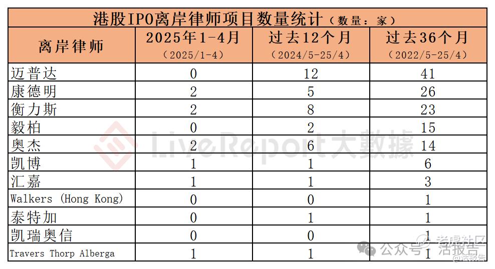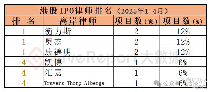 今年1-4月,6家离岸律师为9家港股IPO(开曼主体)提供了上市法律服务,项目数量最多的离岸律师:① 衡力斯、奥杰、康德明(各2家)。