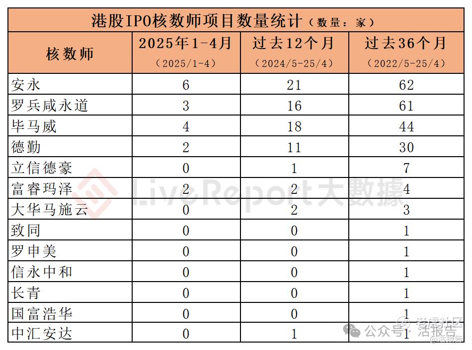 今年1-4月,以及过去12个月和36个月的统计期间,分别有5家、8家和13家核数师参与港股IPO上市审计,各期间项目数量最多的核数师为: