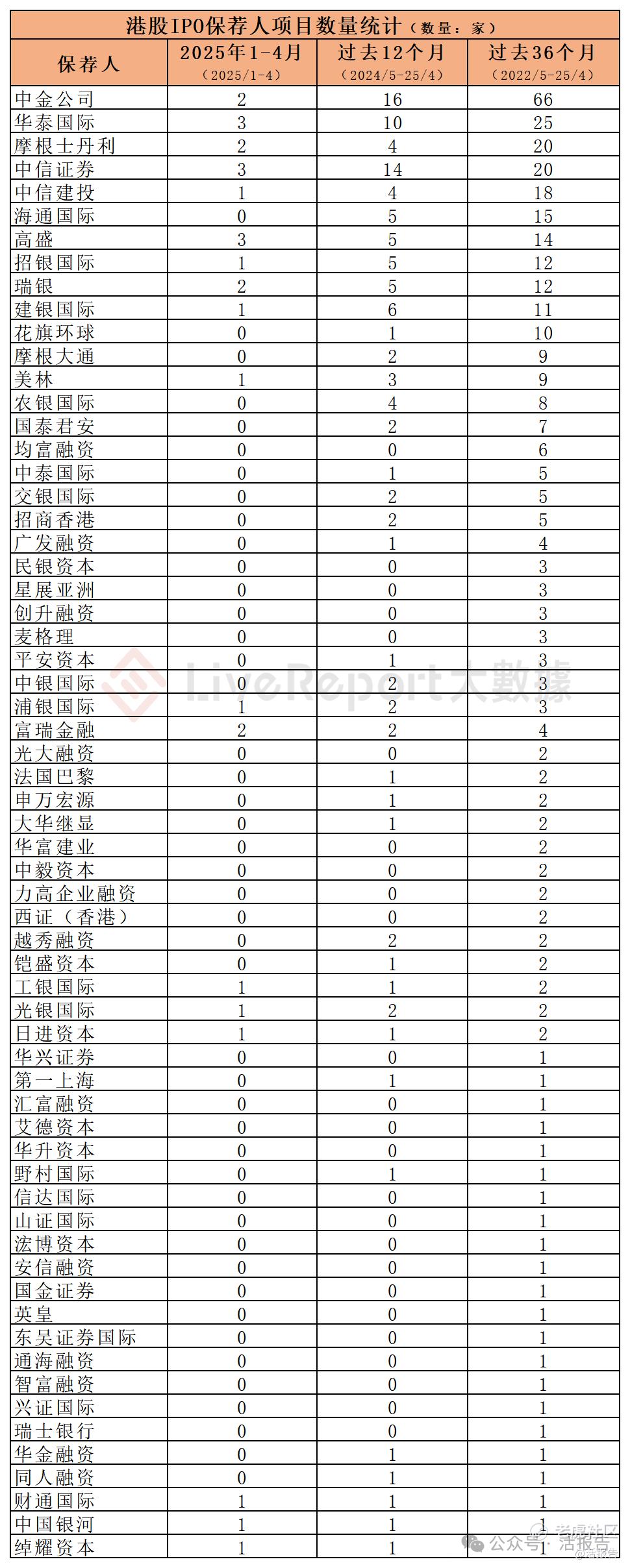 过去36个月期间,63家保荐人参与了216家港股IPO上市保荐,项目数量最多的保荐人:① 中金公司(66家);② 华泰国际(25家);③ 摩根士丹利 & 中信证券(各20家)。