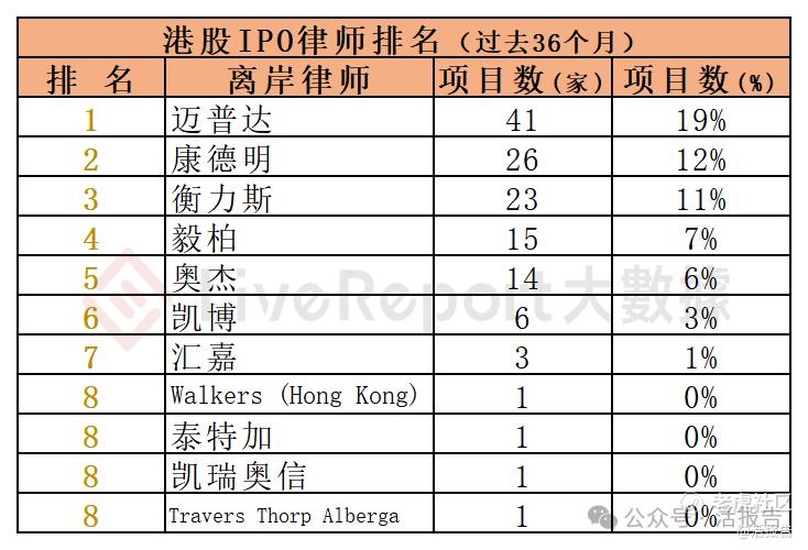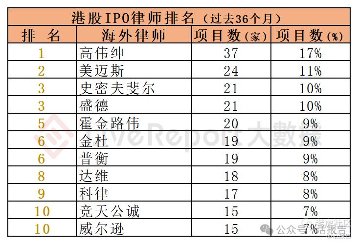 过去36个月期间,约165家海外律师为216家港股IPO提供了上市法律服务,项目数量最多的海外律师:① 高伟绅(37家);② 美迈斯(24家);③ 史密夫斐尔、盛德(各21家)。