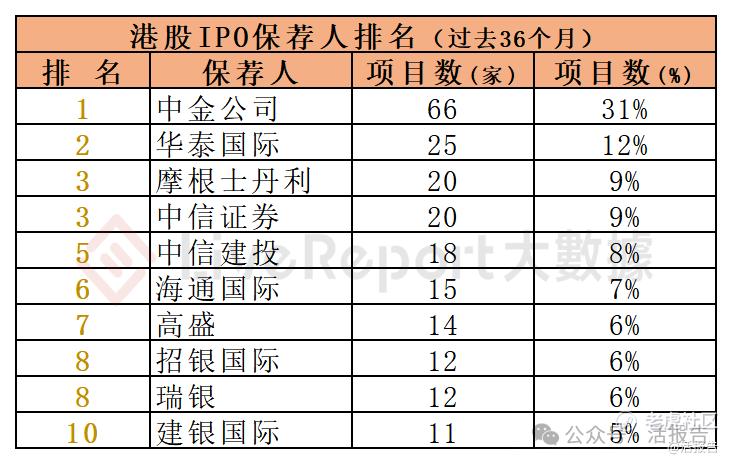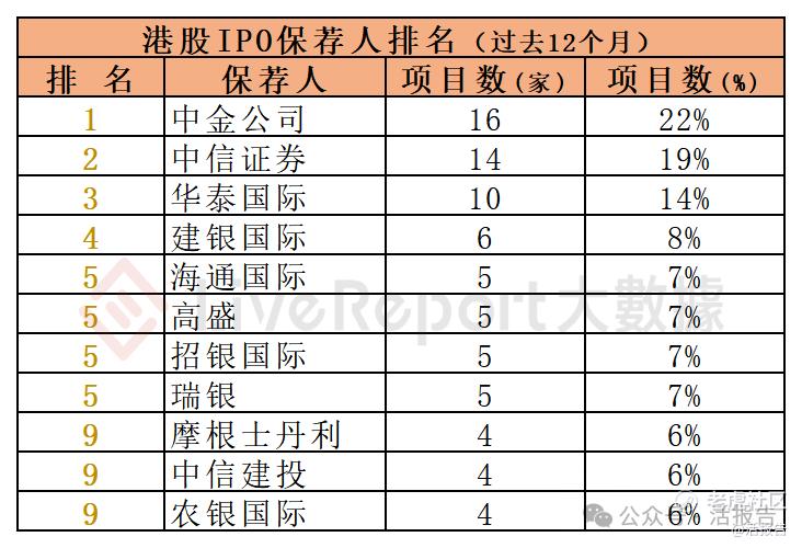 过去12个月期间,38家保荐人参与了72家港股IPO上市保荐,项目数量最多的保荐人:① 中金公司(16家);② 中信证券(14家);③ 华泰国际(10家)。