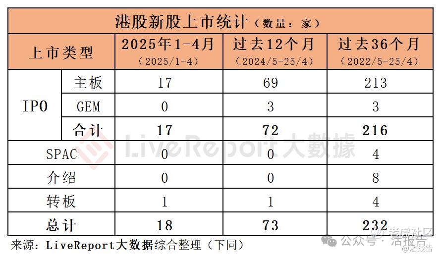 据LiveReport大数据,2025年1-4月,港股市场迎来新上市公司共18家,其中IPO主板上市17家,GEM转主板1家。截至4月底的过去12个月和36个月期间,新上市公司总数量则分别为73家和232家,其中IPO上市分别为73家和232家。