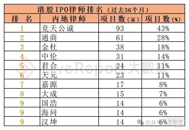过去36个月期间,48家内地律师为216家港股IPO提供了上市法律服务,项目数量最多的内地律师:① 竞天公诚(93家);② 通商(61家);③ 金杜(38家)。