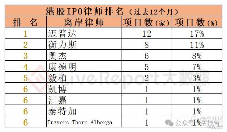 过去12个月期间,9家离岸律师为37家(开曼主体)港股IPO提供了上市法律服务,项目数量最多的离岸律师:① 迈普达(12家);② 衡力斯(8家);③ 奥杰(6家)。