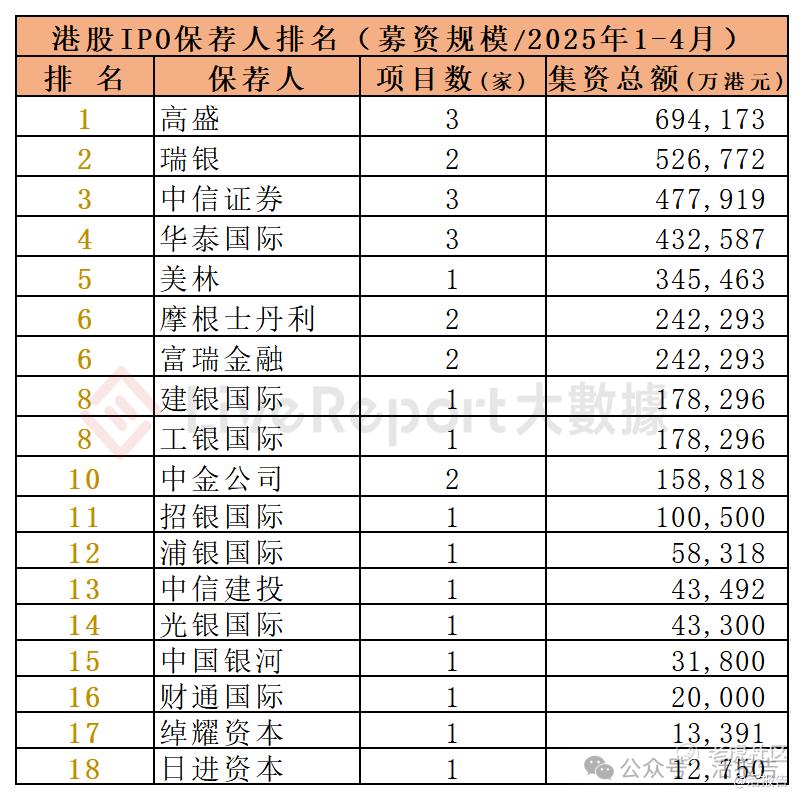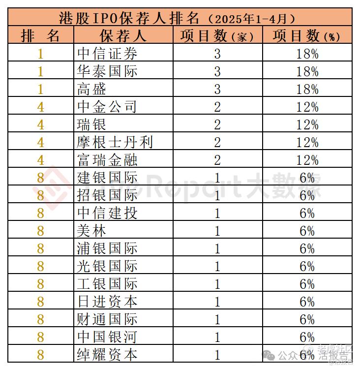 2025年1-4月,18家保荐人参与了17家港股IPO上市保荐,项目数量最多的保荐人为:①中信证券、华泰国际、高盛(各3家)。